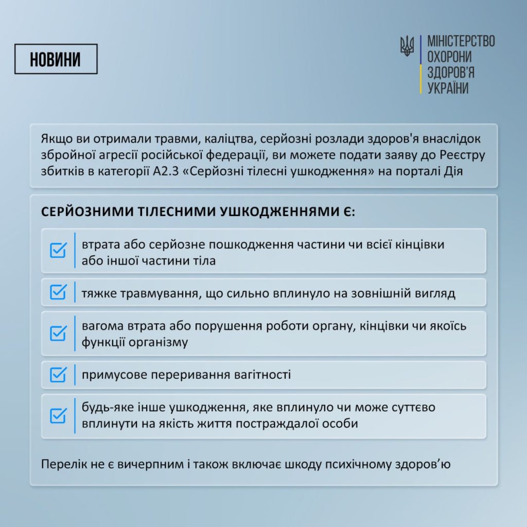 🔎 На порталі Дія доступні 13 категорій заяв про шкоду внаслідок війни. П’ять із них стосуються безпосередньо здоров’я: